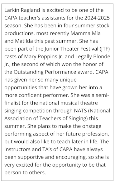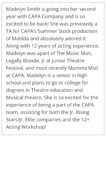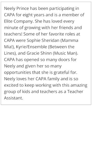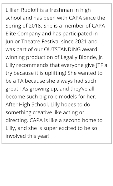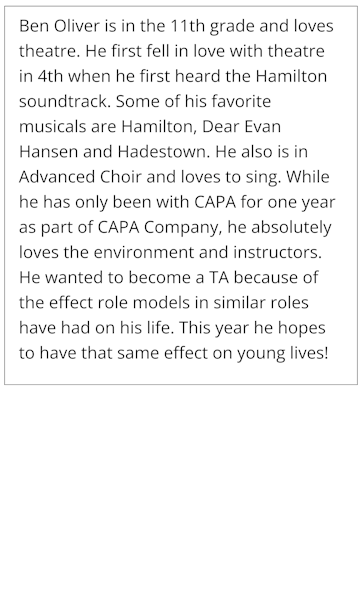 This opportunity is for high school students ages 13-18 who have completed at least one season in a CAPA Company and wish to be considered for a Teacher Assistant (TA) position. The TA role provides opportunities for leadership development and/or partial tuition assistance for CAPA Company participation.